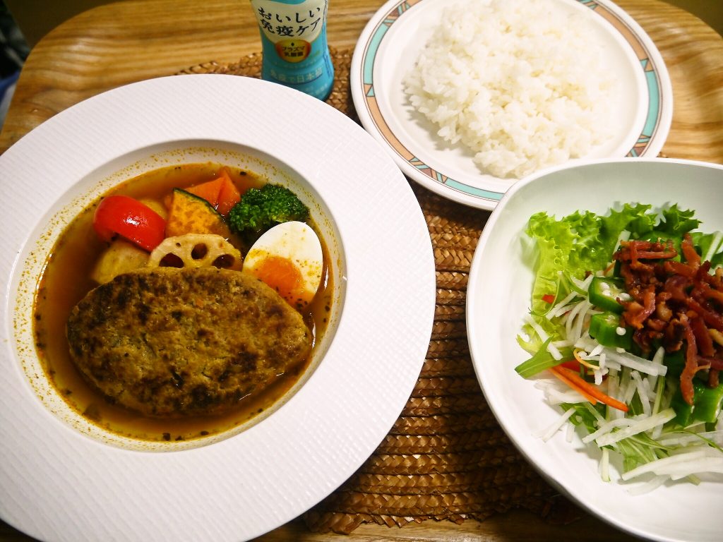 【根菜バーグのスープカレー、ベーコンとオクラの大根サラダ】