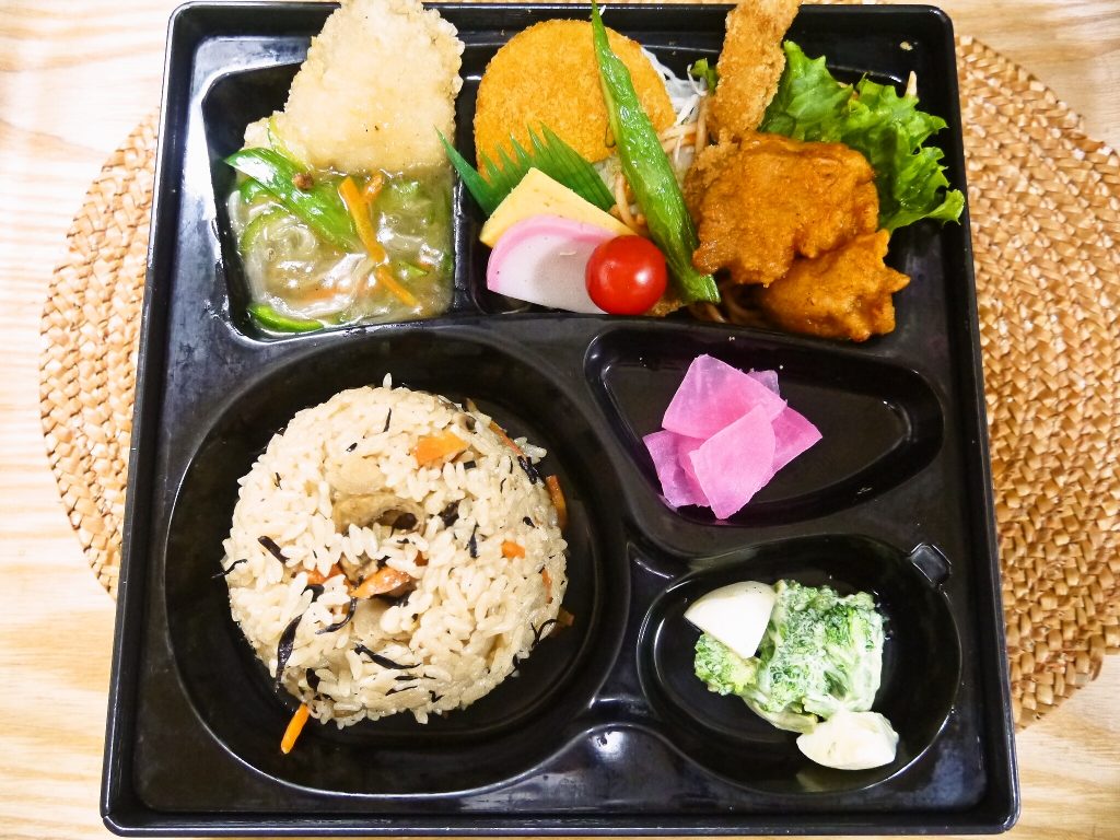 鶏五目炊き込みご飯 白身魚の塩あんかけ カレーコロッケ 等