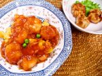 酢豚、カレイ塩焼き、海老天と魚肉ソーセージの天ぷら、鶏のピリ辛揚げ、ふきの煮物、