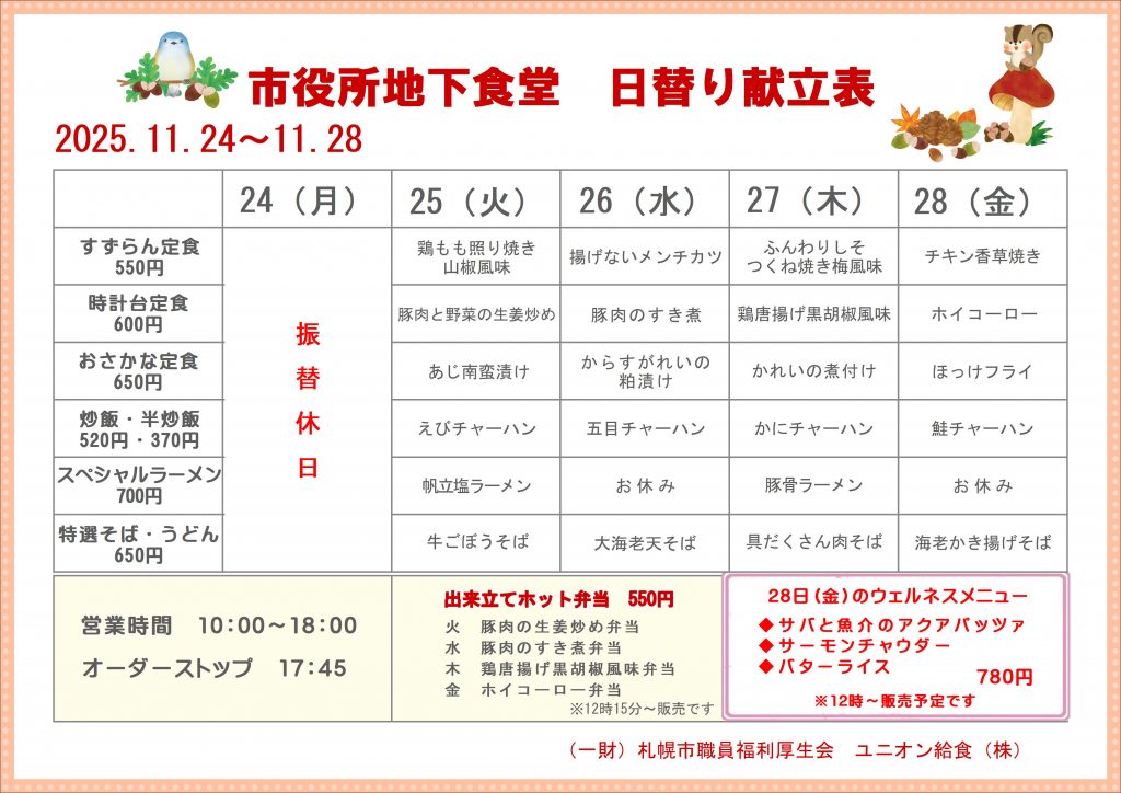 11月24日~11月28日のおすすめ献立表です!