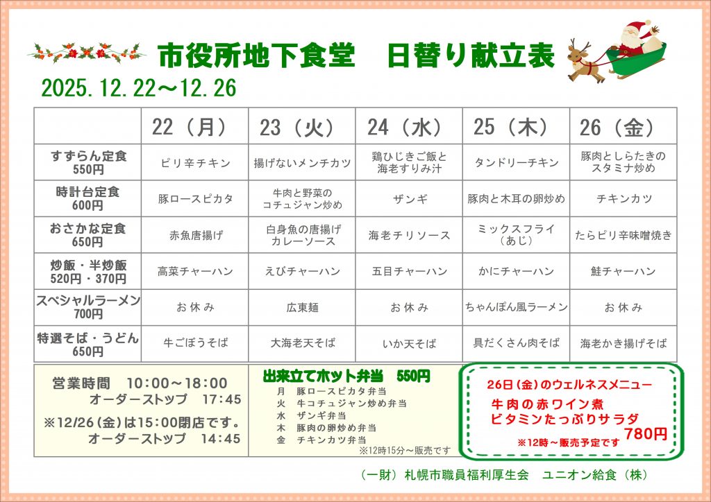 - 12月22日~12月26日のおすすめ献立表です! - 2025年12月18日